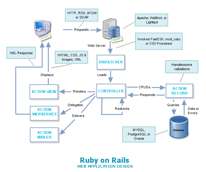 The above-described features are distributed in the following Rails’ components and the Fig(Create Ruby on Rails Overall architecture shows the interaction between some of these components) listed below: